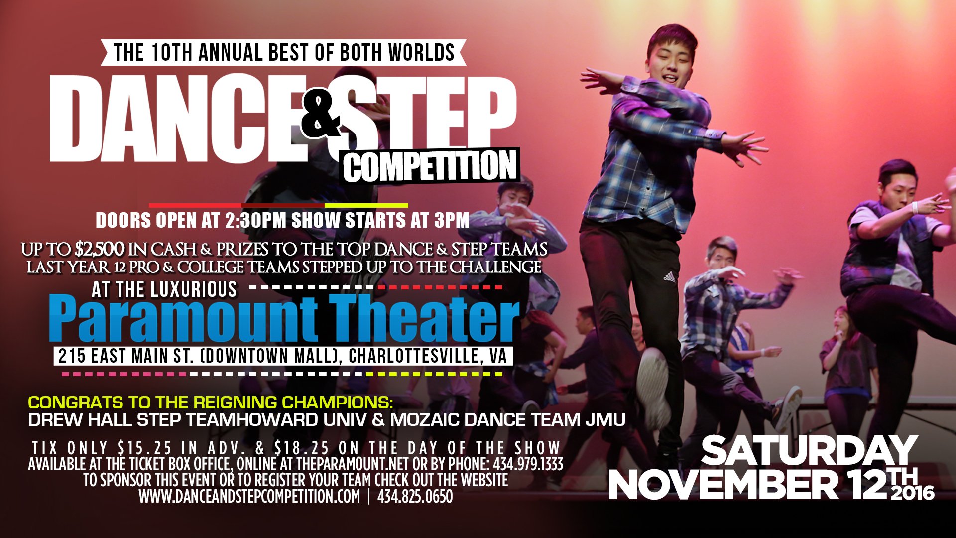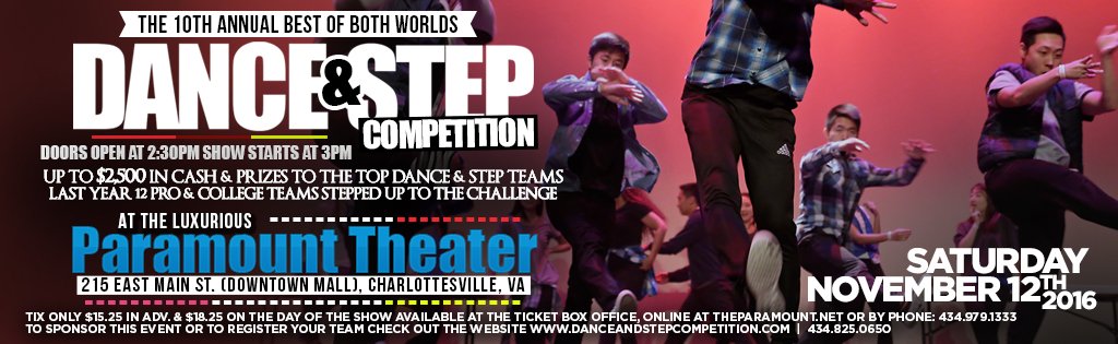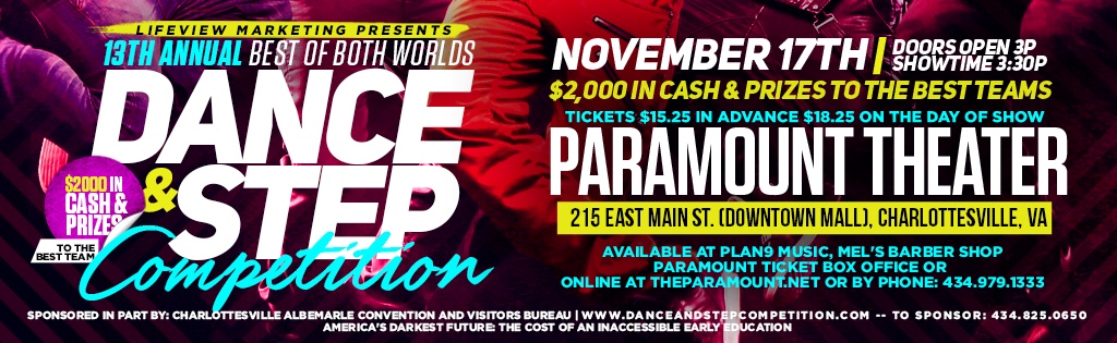 Teams have traveled from North Carolina, Maryland-D.C., and throughout Virginia to compete in this show. Cash and prizes $500-$750 will be awarded and the winner will receive automatic entry into the 13th Annual Best of Both Worlds Dance and Step Competition at the Paramount Theater on November 17th.